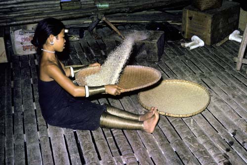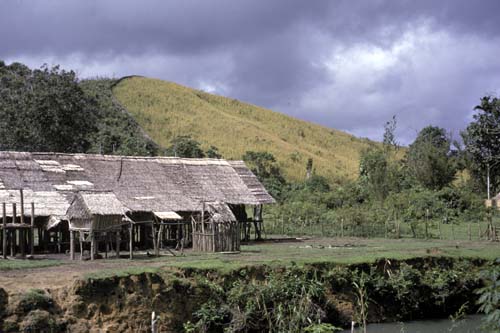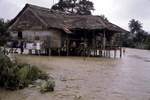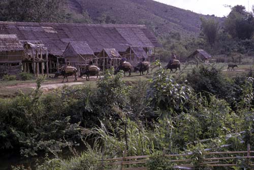 Rungus men and boys. Transporting by kerabau surplus harvested rice to sell at Chinese shops, passing in front of longhouse and chicken house.